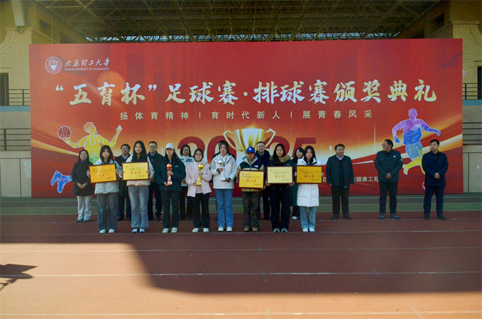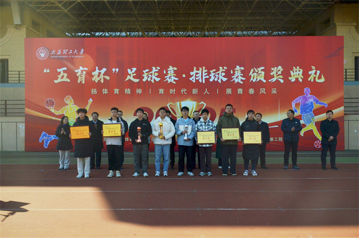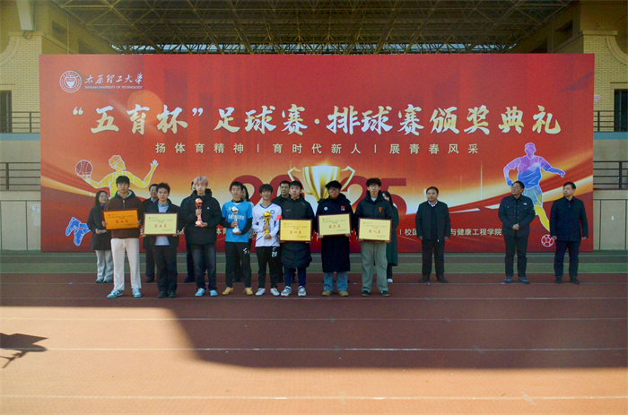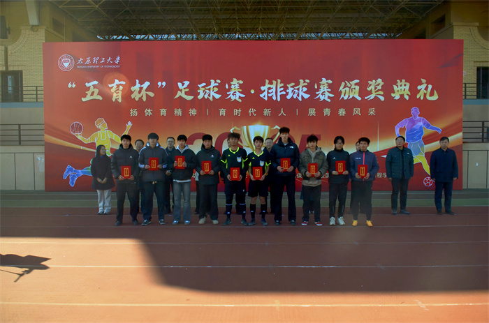 11月21日,太原理工大学2025年“五育杯”足球赛、排球赛颁奖仪式在明向校区东操场隆重举行。本次活动由校体育运动委员会主办,学生工作部、后勤保障部、校团委及体育与健康工程学院联合协办,是学校深入贯彻党的教育方针、落实“五育并举”、深化“以体育人”的重要实践。校党委常委、副校长王志华出席仪式,相关职能部门及学院负责人共同参加。