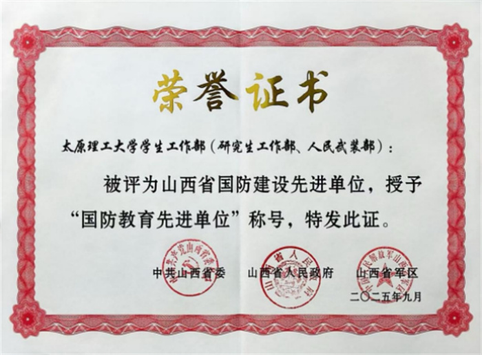 近日省委、省政府、省军区授予太原理工大学学生工作部(研究生工作部、人民武装部)“山西省国防建设先进单位”荣誉称号。这是对我校国防教育工作的高度认可与充分肯定。