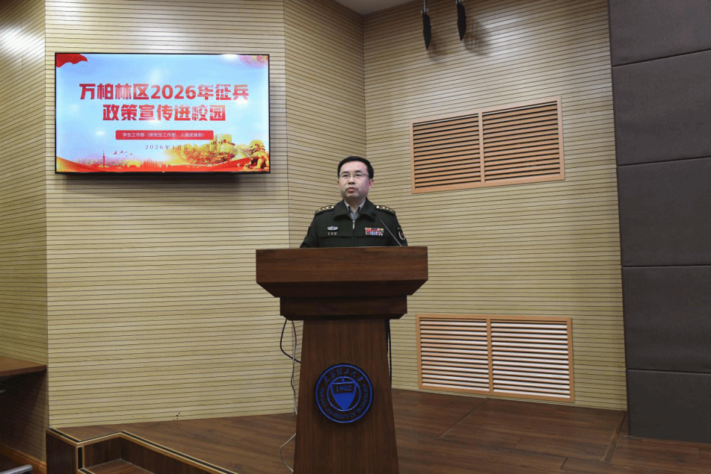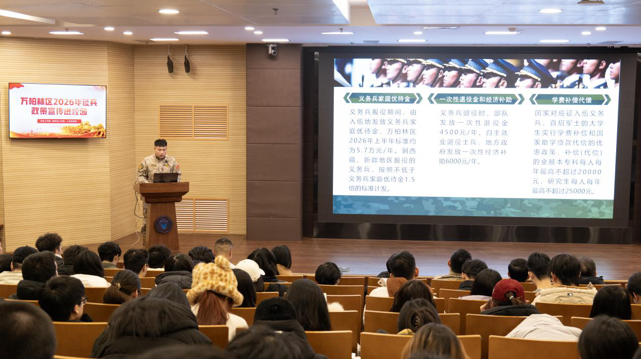 为深入贯彻习近平强军思想,全面落实新时代征兵工作要求,进一步激发高校学子参军报国热情,1月13日下午,万柏林区2026年征兵政策宣传进校园活动在我校明向校区图书馆报告厅举行。活动由校学生工作部(研究生工作部、人民武装部)副部长李文彬主持,万柏林区征兵领导小组副组长窦培明,校学生工作部(研究生工作部、人民武装部)部长贺光明出席,万柏林区征兵办公室、校人民武装部国防教育科相关负责人及230余名学生参加。