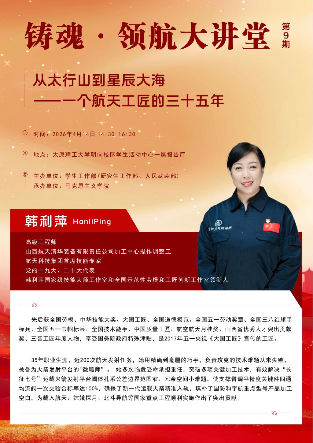 “铸魂·领航”大讲堂 (第9期)活动预告 | 从太行山到星辰大海—一个航天工匠的三十五年