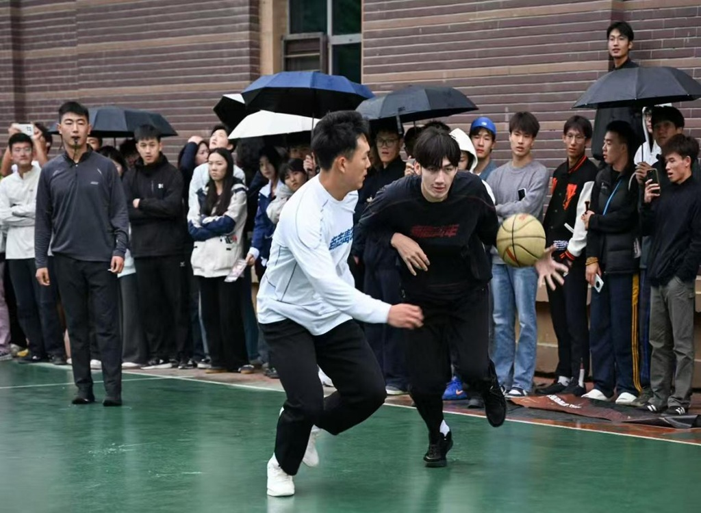 第二节结束后,雨势骤然加大,瓢泼大雨导致场地积水严重,无法继续比赛。赛事组织方协调将比赛转移至室内场地。转场过程中,体育学院团学组织同学冒雨搬运器材,现场观众不仅未因天气离场,反而被赛事热血氛围感染,主动协助工作人员整理场地——欢呼声与雨声交织,校园里的篮球热情丝毫未减,反而愈发浓烈。