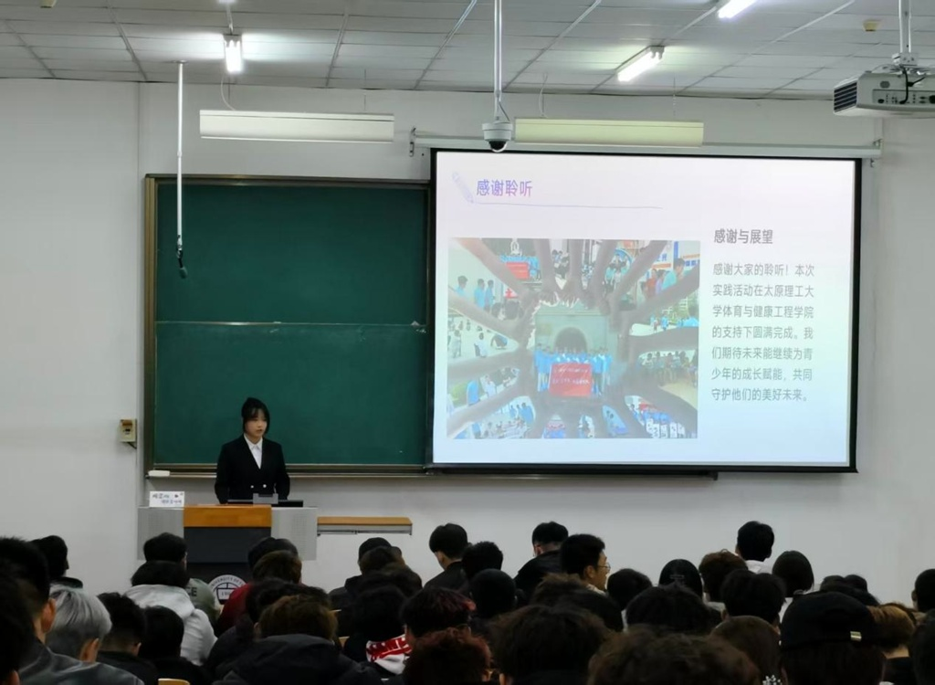 汇报环节,各实践团队代表依次登台,通过 PPT 演示、视频展播等多元形式,生动呈现实践历程与成果。从深入社区开展体育健康知识普及,到走进乡村中小学开展专业体育支教,再到推动运动康复志愿服务下沉基层一线,队员们以详实的数据、鲜活的案例,分享了服务过程中的成长感悟,同时客观剖析实践中的不足与改进方向。其中,曹丽华同学在太原理工大学“铸魂·领航”实践育人先锋队(陕西实践队)汇报过程中,以精心制作的vlog视频与内容详实的 PPT,不仅呈现了体育与健康工程学院学子的实践风采,更提及本次实践团队汇聚了来自其他学院的 6 名优秀学子,跨学院学子携手参与,在服务社会的过程中相互学习、取长补短,既加深了对专业应用的理解,更清晰认识到自身不足,为后续提升自我、成长为有实力的体育领域从业者奠定了坚实基础。整场汇报内容扎实、形式新颖,让在场同学深刻体会到 “三下乡” 活动的现实价值与深远意义,为实践育人工作注入蓬勃青春活力。