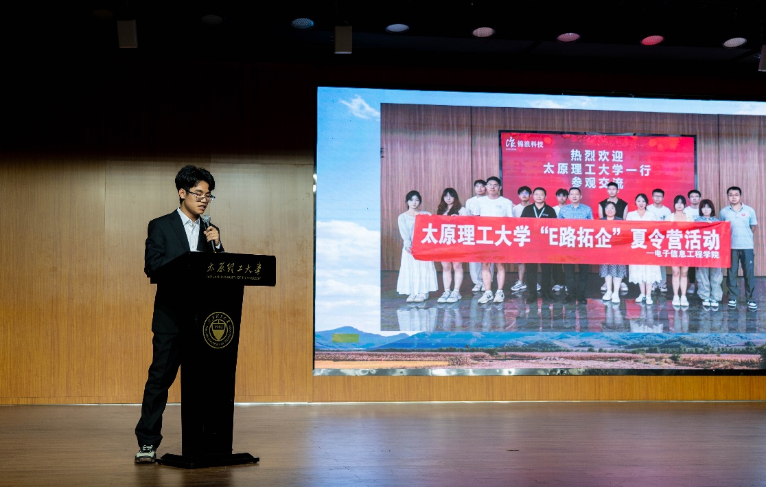推普短剧结束后,赴象山访企团队成员代表上台分享实践感悟。团队此前在宁波象山开展5天企业走访,成员围绕车间技术观察、政校企座谈交流等经历,分享对电子信息行业前沿动态的认知,以及实践对个人职业规划的启发,为在场同学提供了宝贵的行业参考。
