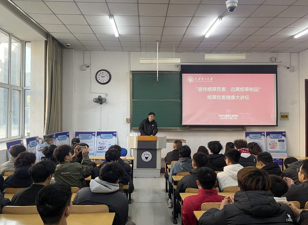为贯彻落实《健康中国行动(2019—2030年)》控烟行动目标任务,精准掌握高校大学生烟草流行现状及影响因素,降低青年群体烟草依赖风险,同时以高校为辐射平台向家庭、社会传递控烟共识,2025年10月31日,体育与健康工程学院携手山西省疾控中心在明向校区行知楼B113教室举行“宣传烟草危害,远离烟草制品”烟草危害健康大讲坛。山西省疾控中心马麟科长、王鑫老师、太原市疾控中心史坚科长,太原市万柏林区疾控中心副主任胡瑞琴受邀走进校园,体育与健康工程学院团委副书记兼学工办副主任姜昆以及150名青年学生参与活动。