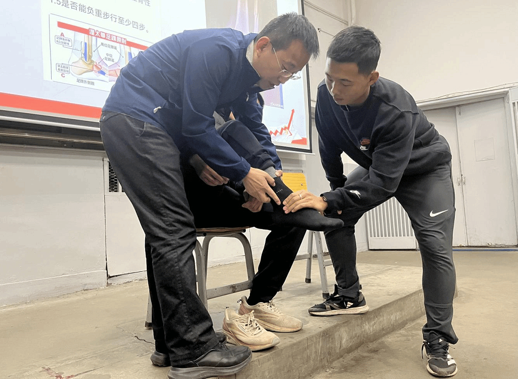 在案例剖析环节,针对脚踝伤病专题教学,吕医生打破“扭伤仅需冰敷”的片面认知,创新性提出“疼痛程度、肿胀范围、活动受限情况”三维分级判断标准。通过现场示范,他逐一讲解不同损伤级别的处置方案:一级扭伤(韧带轻微拉伸)以休息冰敷为主;二级扭伤(韧带部分撕裂)需采用弹性绷带加压固定;三级扭伤(韧带完全断裂)则必须立即就医,避免延误治疗。