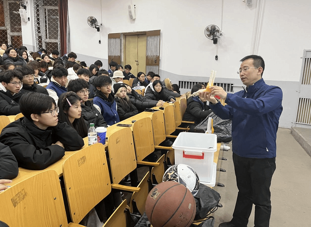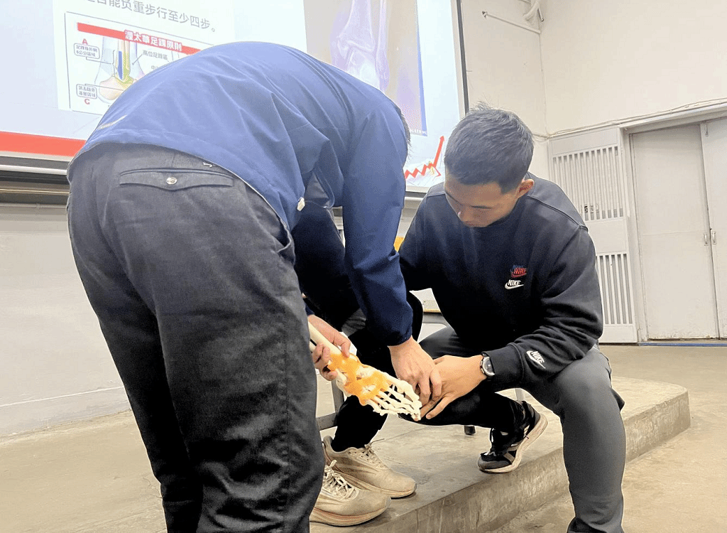 在理论讲解环节,吕文科医生通过丰富的临床诊疗经验与国家队保障经历,构建起“生理结构-损伤机理-分级处置-康复训练”的完整知识体系。他通过解剖模型演示与动态示意图解析,直观呈现膝关节复杂结构特点,明确指出“高强度训练中膝关节承受压力可达体重3-5倍”的核心风险点,详细区分前交叉韧带损伤、半月板损伤等常见膝伤的诱因与症状差异,为学子建立科学认知基础。针对肌肉拉伤等突发状况,吕医生重点传授“PRICE原则”(保护、休息、冰敷、加压、抬高)的实操规范,强调“动态拉伸激活肌肉”的赛前防护关键环节,纠正传统训练中的认知误区。