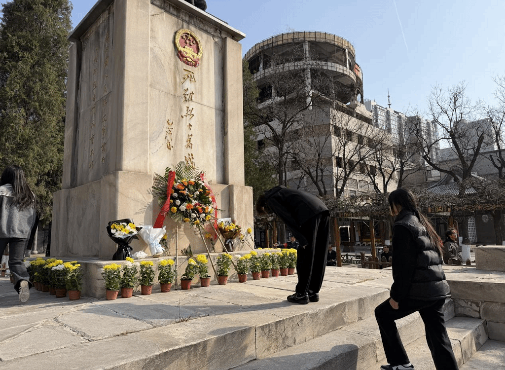 随后,全体人员移步至革命烈士纪念碑前,整齐列队、垂首肃立,全场默哀,深切缅怀为国家和人民英勇献身的革命先烈。大家手持鲜花,依次缓步上前,将鲜花轻轻敬献于纪念碑前,以最庄重、最诚挚的方式,表达对革命先烈的无尽哀思与崇高敬意。驻足瞻仰纪念碑文,学子们在历史的厚重回响中,感悟革命先辈不畏艰险、顽强拼搏的精神品格,进一步厚植青年学子的爱国情怀与使命担当。