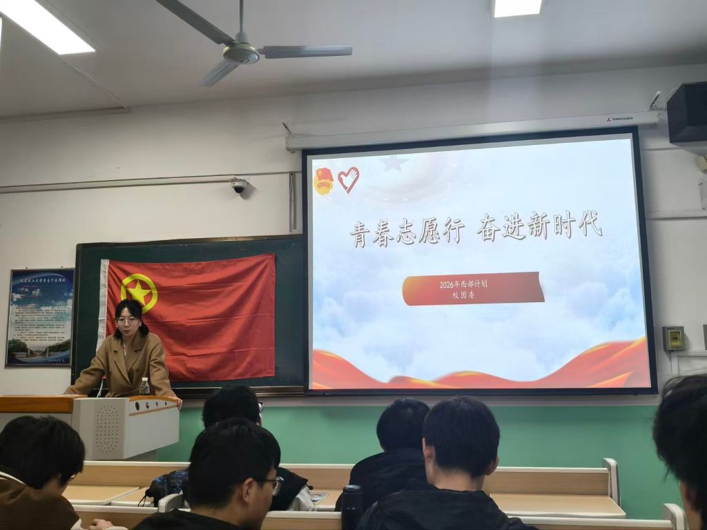 尹海先老师聚焦于“西部计划”政策方针,通过列举广大青年学子援疆助藏的优秀示例,展示我校开展“西部计划”取得的显著成果,强调发展西部的必要性,坚定同学们驰援边疆,发展西部的决心,也拓宽同学们未来的行进道路。