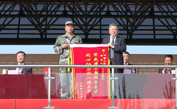 校党委书记吴玉程代表学校向承训单位中国人民解放军某部赠送锦旗,对他们的辛勤工作表示感谢。