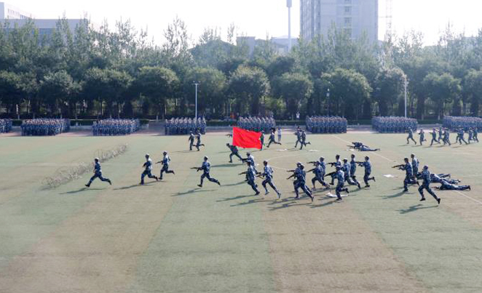 校长黄庆学下达开始命令后,军训汇报表演正式开始。伴随着威武雄壮的中国人民解放军军歌,由各学院新生组成的护旗方队、劈枪方队、挂枪方队、女生方队和徒手方队等十一个分列式方队,迈着整齐有力的步伐,依次通过主席台接受检阅,充分展示了理工大学子昂扬向上的精神面貌。