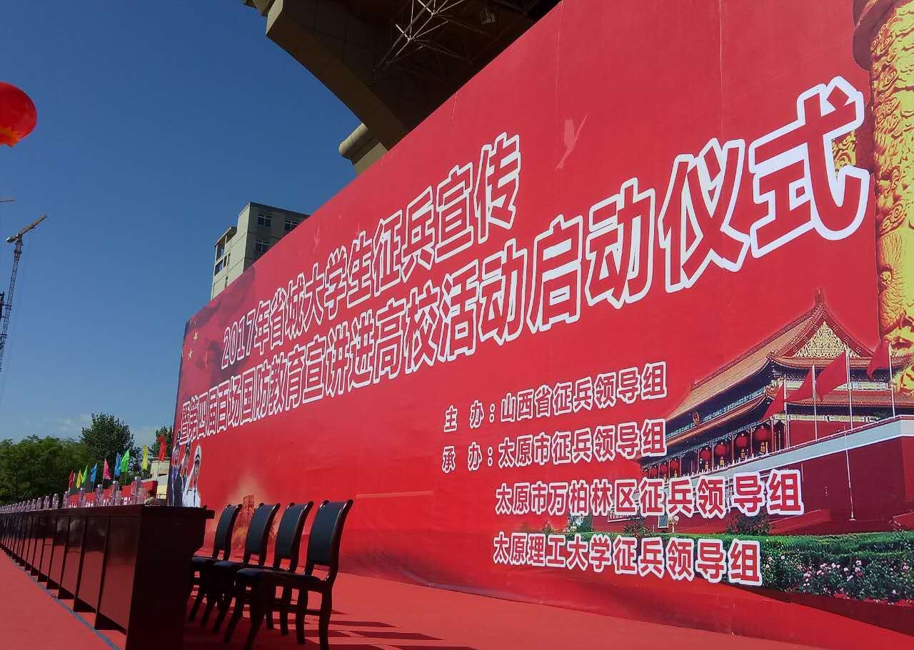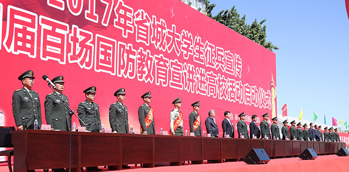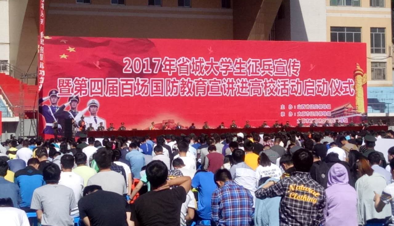 为深入贯彻落实党中央、中央军委强军兴军重大战略决策,引导激励更多高素质青年、更多的高校学子参军入伍,加速推进国防和军队现代化建设,5月10日,“2017年省城大学生征兵宣传暨第四届百场国防教育宣讲进高校活动启动仪式”在我校举行。出席仪式的部队领导有省军区司令员、省征兵领导组副组长邹小平少将,省军区政治委员、省征兵领导组副组长郭志刚少将,省军区后勤部副部长于舰钢大校,省军区后勤部副部长郑泰山大校,太原警备区政治委员张文广大校;地方领导有:太原市委常委、常务副市长王立刚同志,太原市人大常委会副主任、万柏林区委书记常青,万柏林区区长杨俊民,我校党委副书记刘润祥出席了启动仪式。